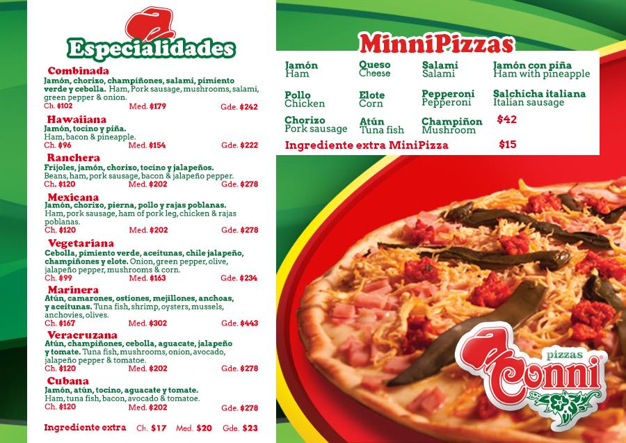 Welcome to Conni Pizzas, a delightful culinary haven located at Blvrd A. López Mateos in Cd Madero, Mexico. This charming eatery specializes in a tantalizing array of pizzas that cater to every palate, offering both vegetarian and meat options. Whether you crave the zesty Pizza Rajas or the savory Pizza Jamon Pina, each pie is available in various sizes for that perfect fit.